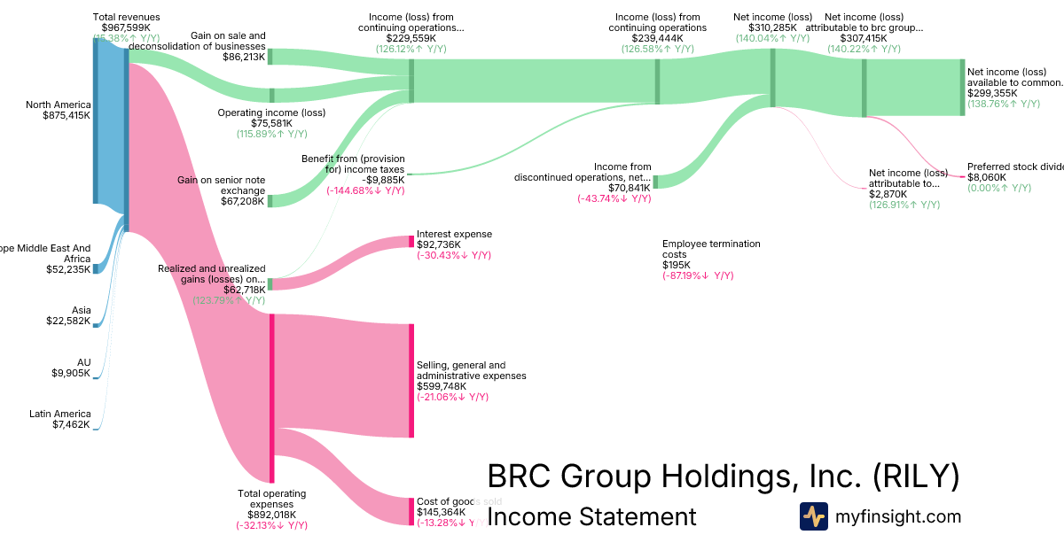 For the year ending 2025-12-31, RILY made $967,599K in revenue. $299,355K in net income. Net profit margin of 30.94%.