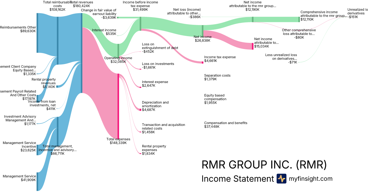 For the quarter ending 2025-12-31, RMR made $180,424K in revenue. $12,110K in net income. Net profit margin of 6.71%.