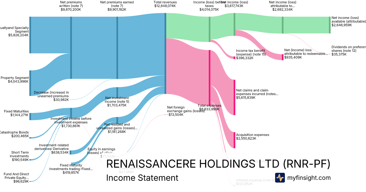 For the year ending 2025-12-31, RNR-PF made $12,848,074K in revenue. $2,646,959K in net income. Net profit margin of 20.60%.