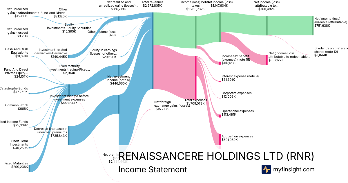 For the year ending 2025-12-31, RNR made $12,848,074K in revenue. $2,646,959K in net income. Net profit margin of 20.60%.