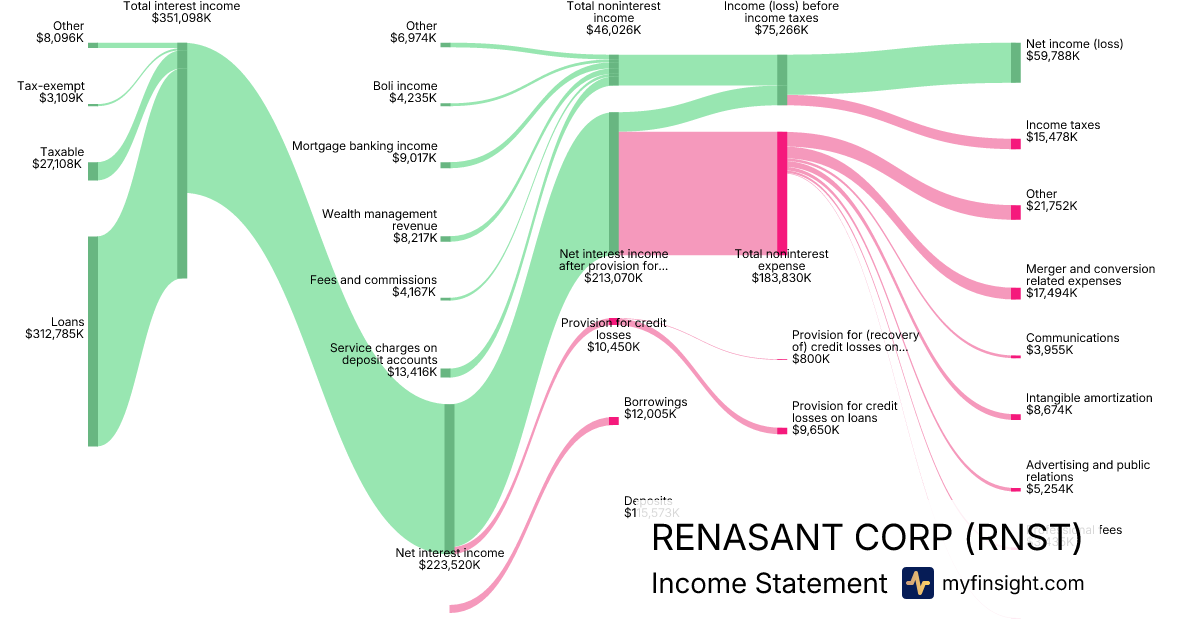 For the quarter ending 2025-09-30, RNST made $718,982K in revenue. $59,788K in net income. Net profit margin of 8.32%.