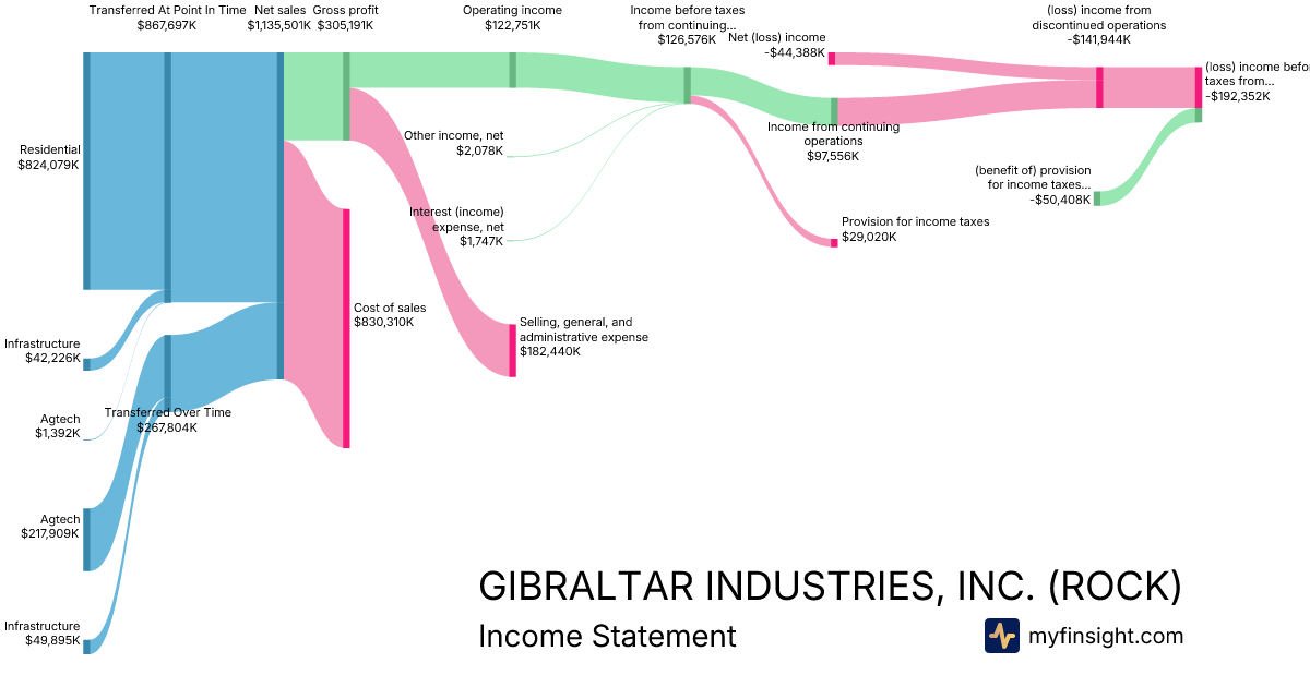 For the year ending 2025-12-31, ROCK made $1,135,501K in revenue. -$44,388K in net income. Net profit margin of -3.91%.