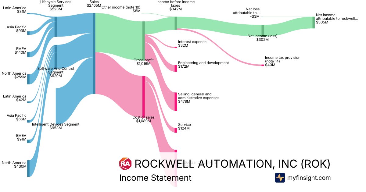 For the quarter ending 2025-12-31, ROK made $2,105M in revenue. $305M in net income. Net profit margin of 14.49%.