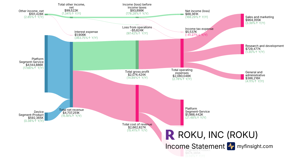 For the year ending 2025-12-31, ROKU made $4,737,251K in revenue. $88,361K in net income. Net profit margin of 1.87%.