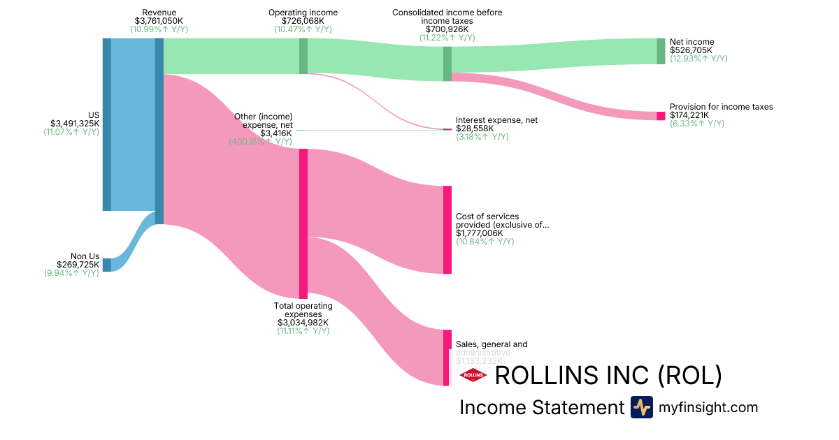 For the year ending 2025-12-31, ROL made $3,761,050K in revenue. $526,705K in net income. Net profit margin of 14.00%.