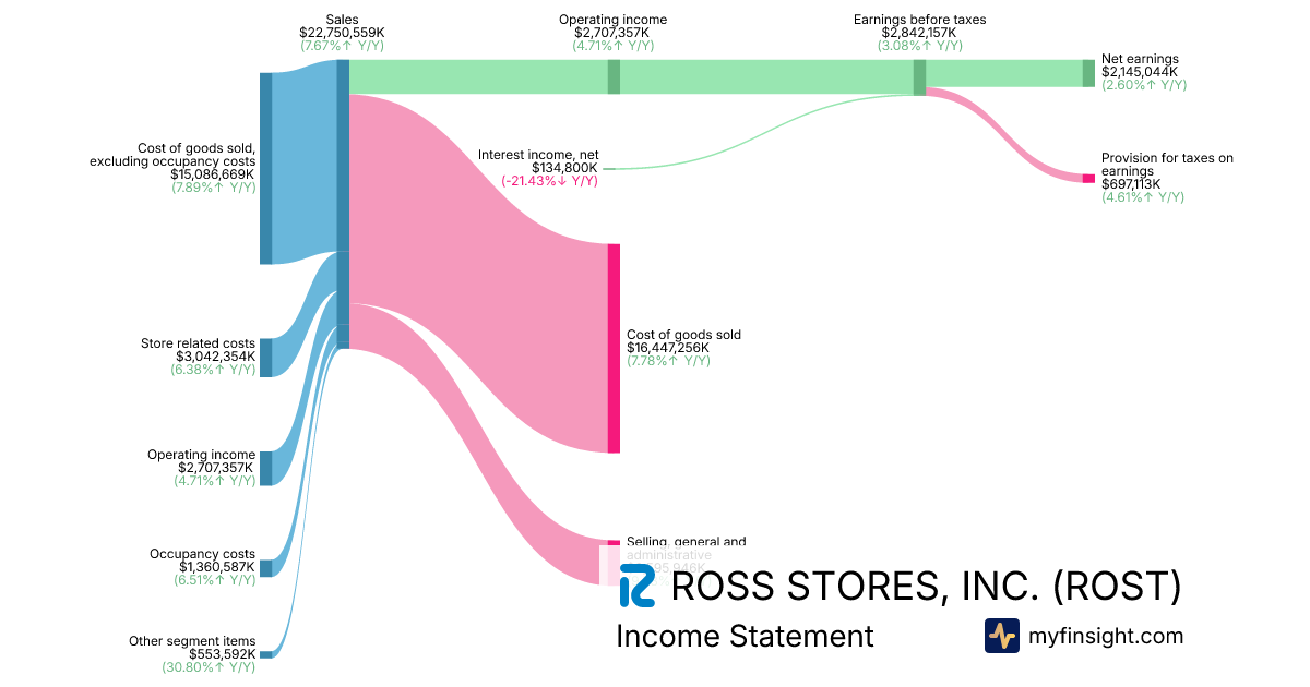 For the year ending 2026-01-31, ROST made $22,750,559K in revenue. $2,145,044K in net income. Net profit margin of 9.43%.