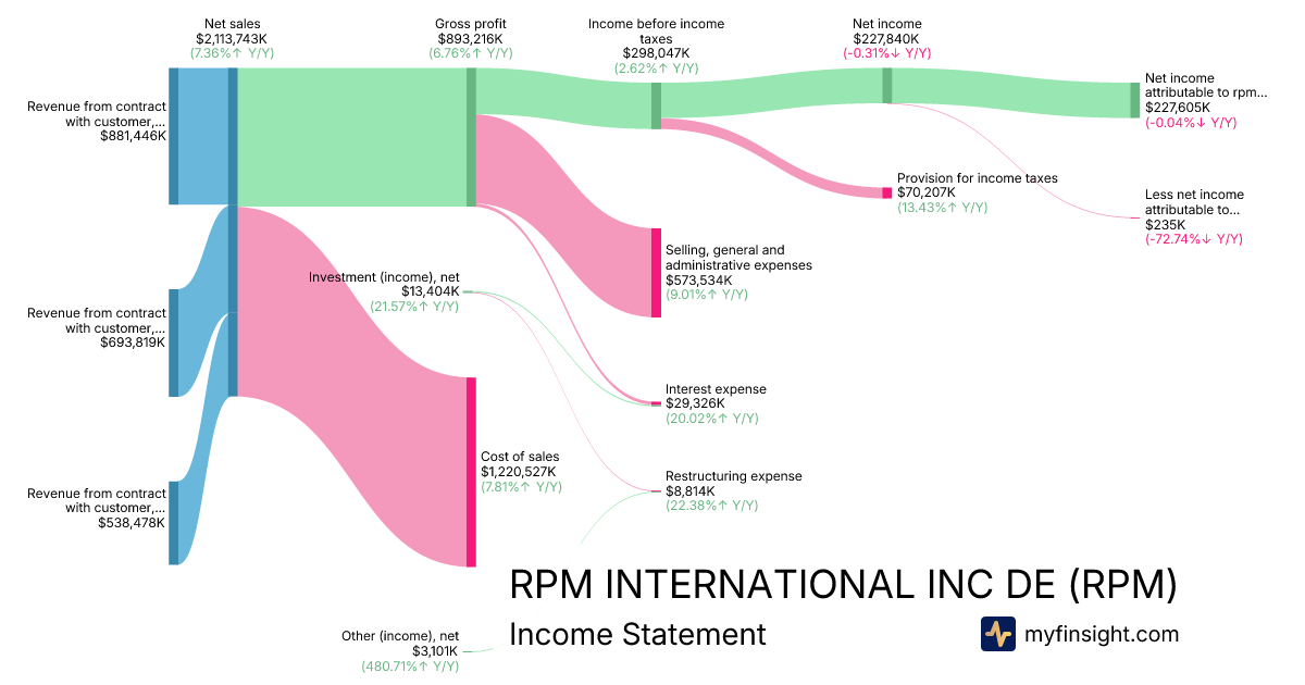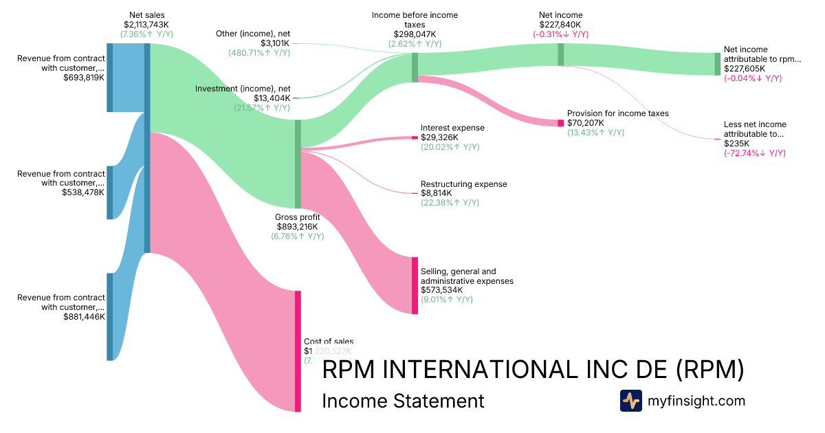 For the quarter ending 2025-08-31, RPM made $2,113,743K in revenue. $227,605K in net income. Net profit margin of 10.77%.