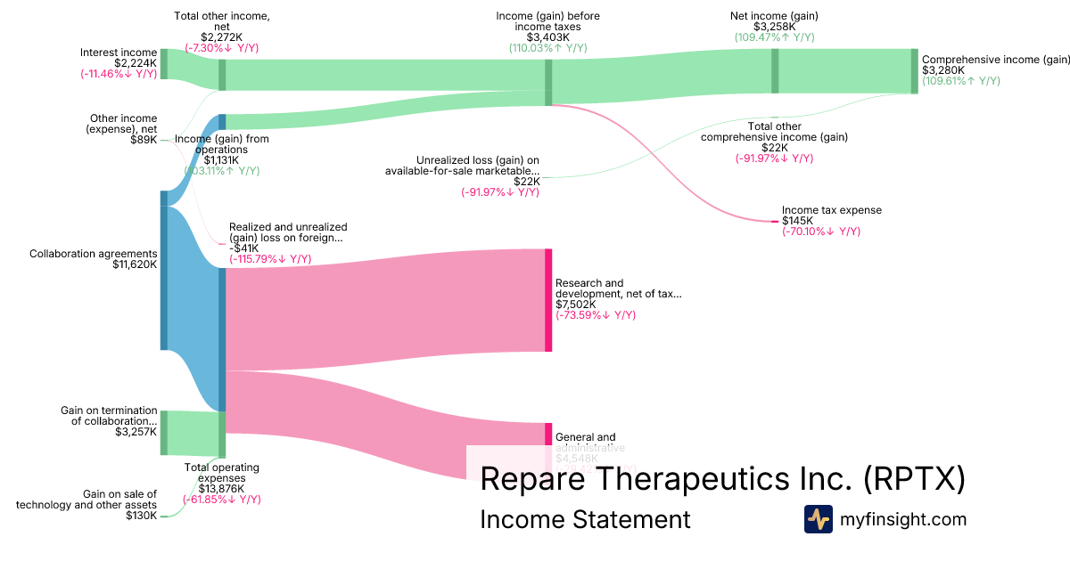 For the quarter ending 2025-09-30, RPTX made $11,620K in revenue. $3,280K in net income. Net profit margin of 28.23%.