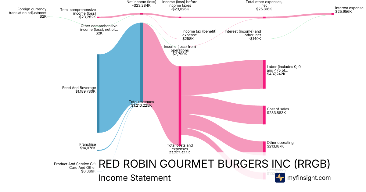 For the year ending 2025-12-28, RRGB made $1,210,225K in revenue. -$23,282K in net income. Net profit margin of -1.92%.