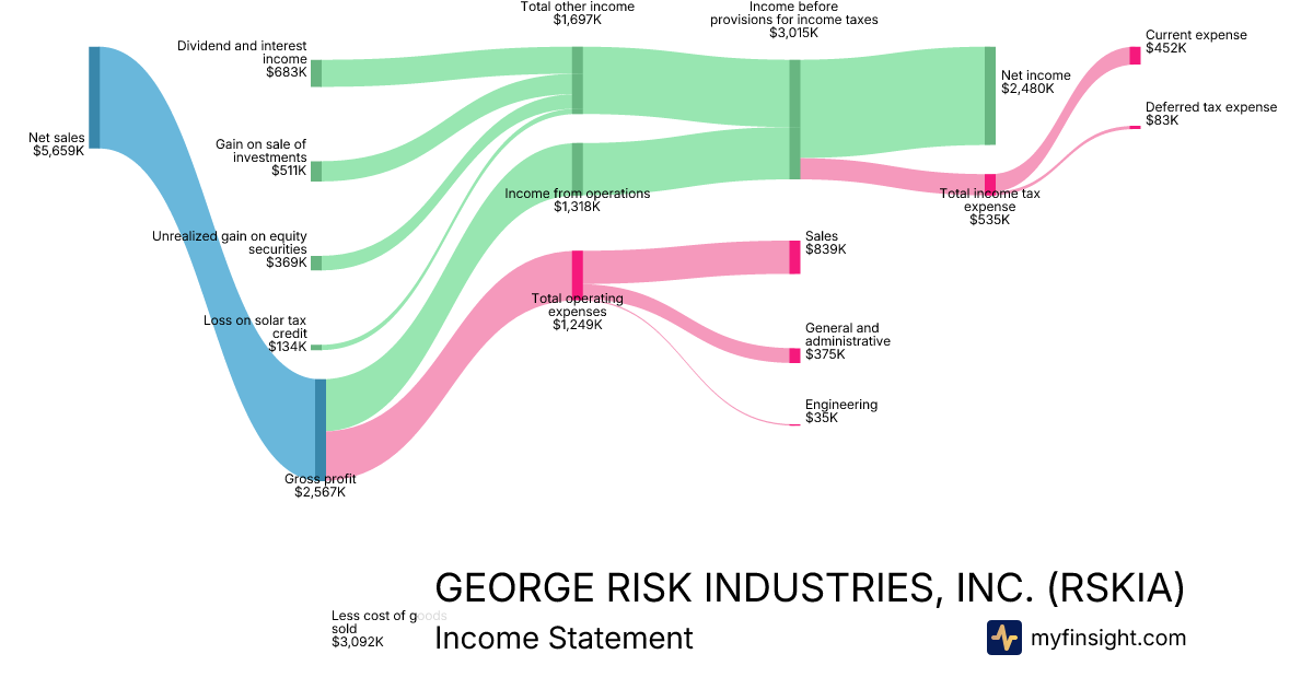 For the quarter ending 2026-01-31, RSKIA made $5,659K in revenue. $2,480K in net income. Net profit margin of 43.82%.