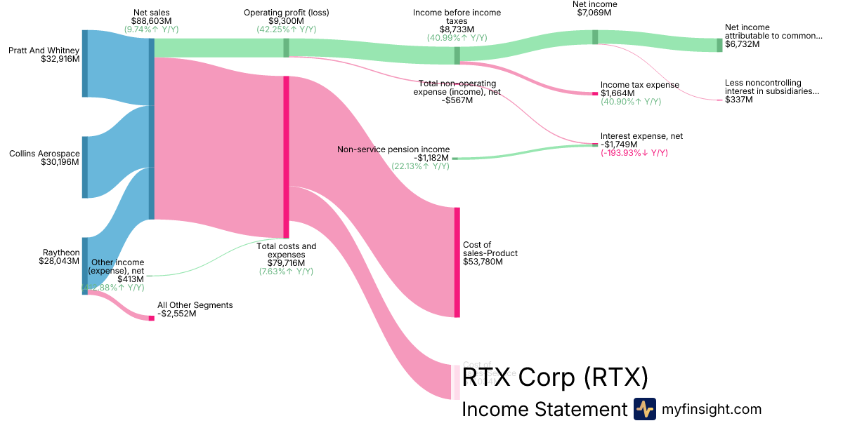 For the year ending 2025-12-31, RTX made $88,603M in revenue. $6,732M in net income. Net profit margin of 7.60%.