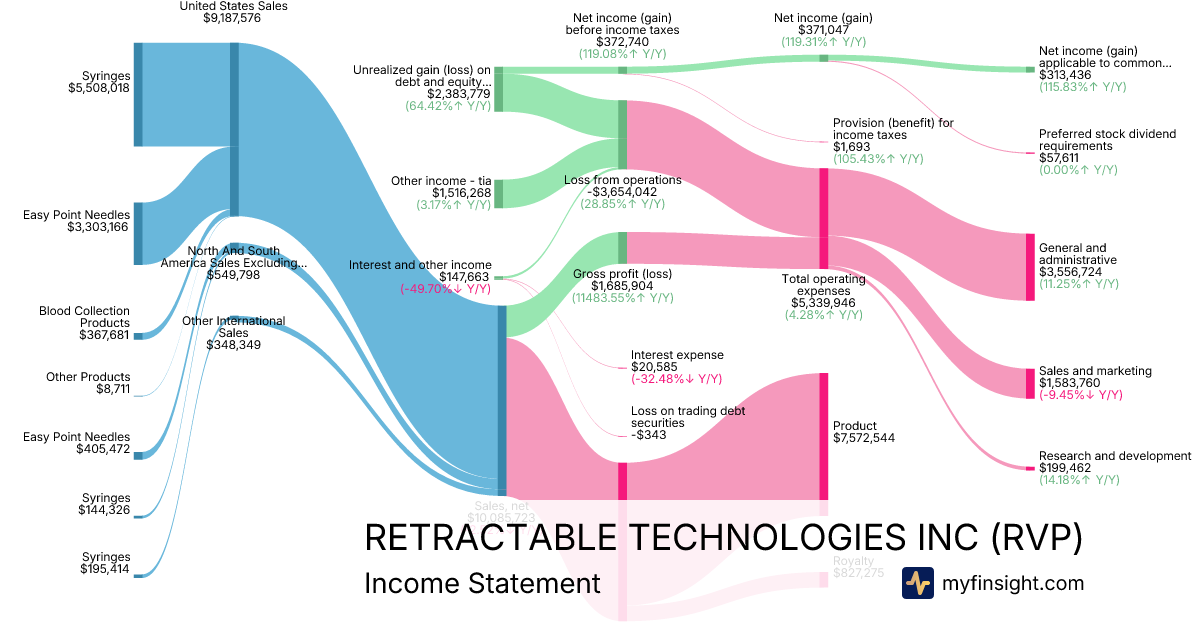 For the quarter ending 2025-09-30, RVP made $10,085,723 in revenue. $313,436 in net income. Net profit margin of 3.11%.
