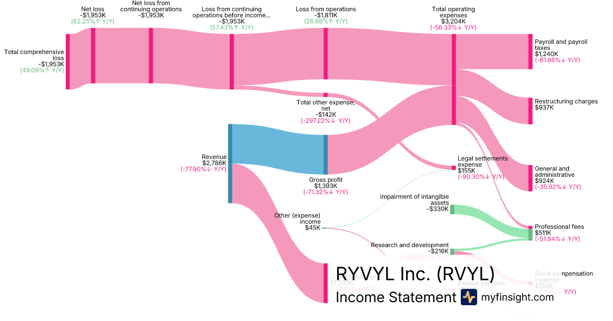 For the quarter ending 2025-09-30, RVYL made $2,786K in revenue. -$1,953K in net income. Net profit margin of -70.10%.