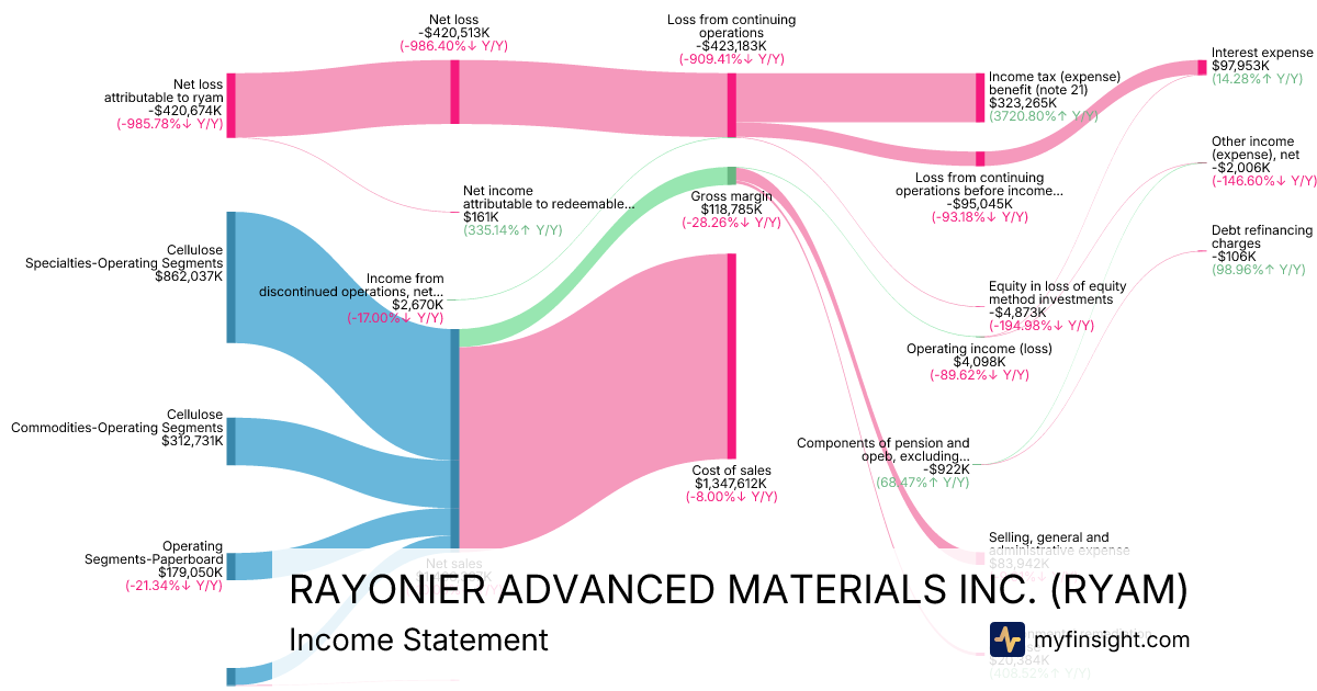 For the year ending 2025-12-31, RYAM made $1,466,397K in revenue. -$420,674K in net income. Net profit margin of -28.69%.