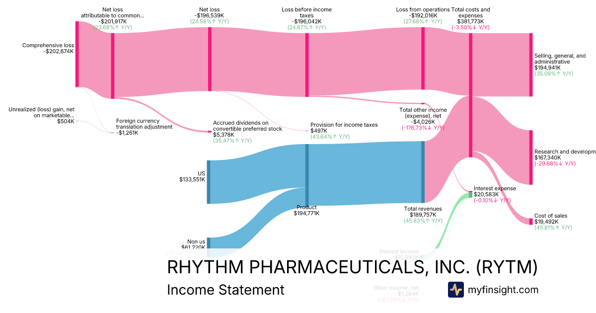 For the year ending 2025-12-31, RYTM made $189,757K in revenue. -$202,674K in net income. Net profit margin of -106.81%.