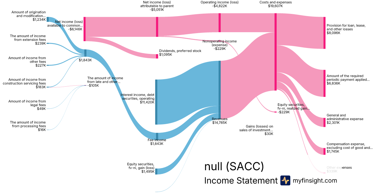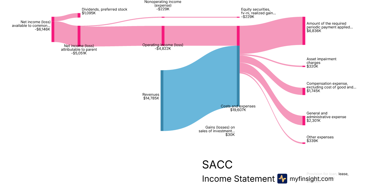 For the quarter ending 2024-09-30, SACC made $14,785K in revenue. -$6,146K in net income. Net profit margin of -41.57%.