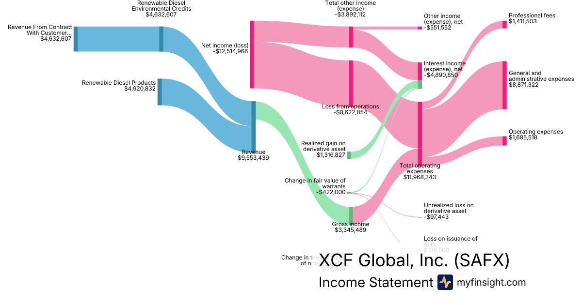For the quarter ending 2025-09-30, SAFX made $9,553,439 in revenue. -$12,514,966 in net income. Net profit margin of -131.00%.