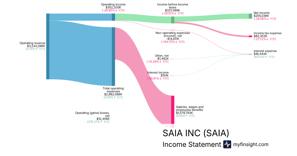 For the year ending 2025-12-31, SAIA made $3,234,286K in revenue. $255,036K in net income. Net profit margin of 7.89%.