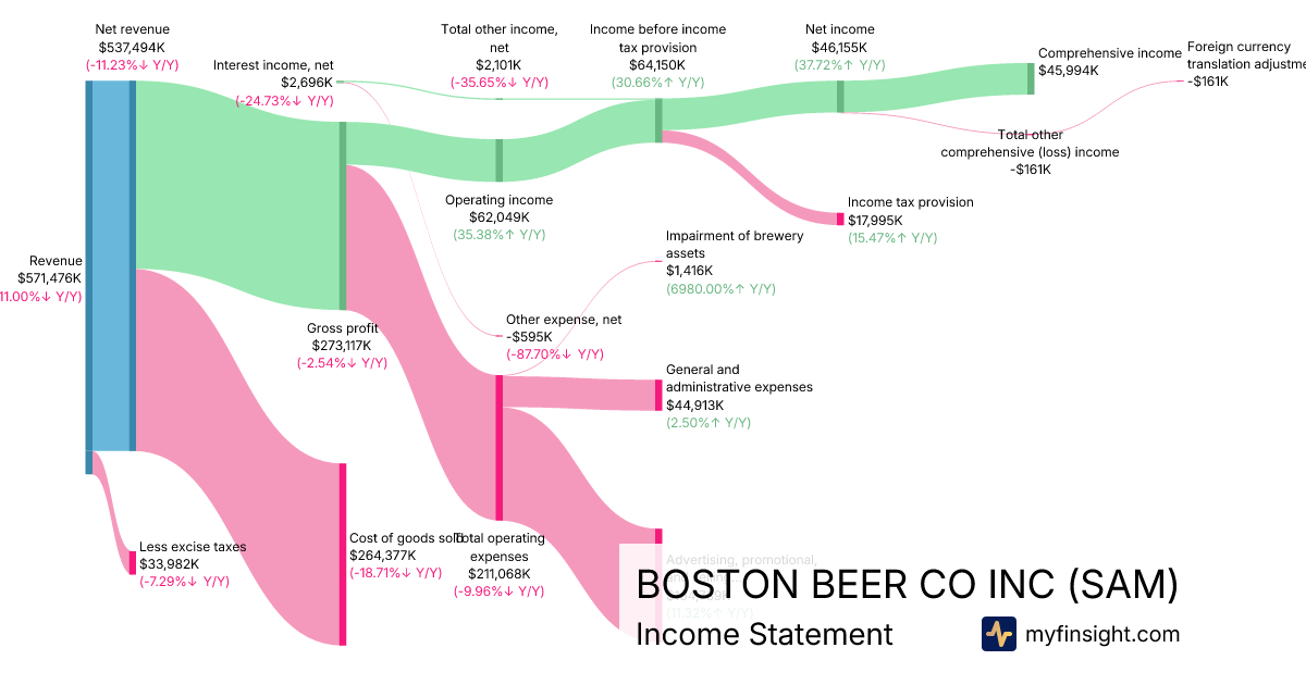 For the quarter ending 2025-09-27, SAM made $537,494,000 in revenue. $45,994,000 in net income. Net profit margin of 8.56%.