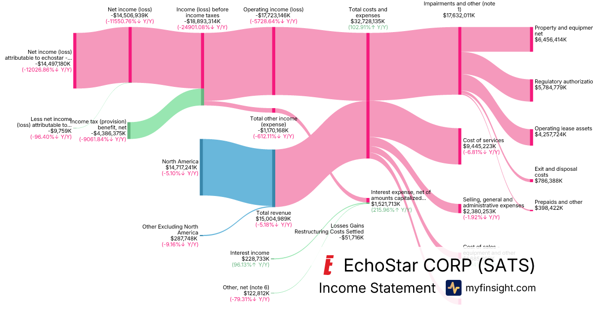 For the year ending 2025-12-31, SATS made $15,004,989K in revenue. -$14,497,180K in net income. Net profit margin of -96.62%.