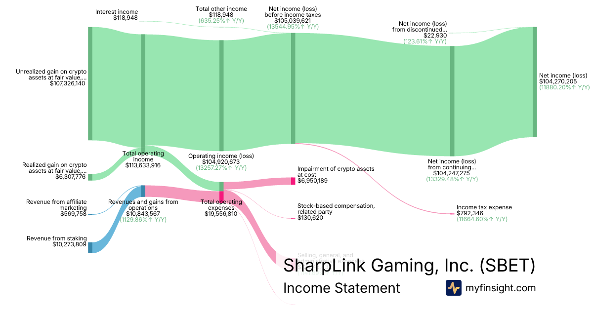 For the quarter ending 2025-09-30, SBET made $10,843,567 in revenue. $104,270,205 in net income. Net profit margin of 961.59%.