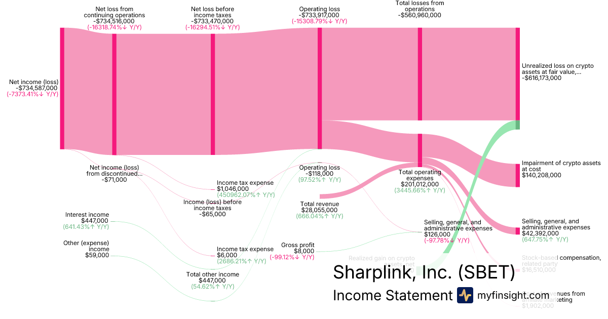 For the year ending 2025-12-31, SBET made $28,055,000 in revenue. -$734,587,000 in net income. Net profit margin of -2618.38%.
