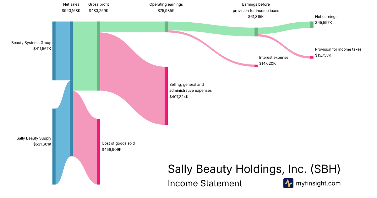 For the quarter ending 2025-12-31, SBH made $943,168K in revenue. $45,557K in net income. Net profit margin of 4.83%.