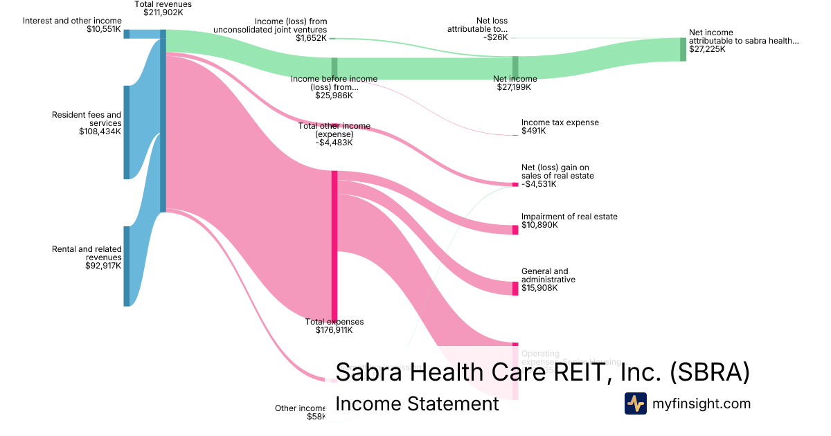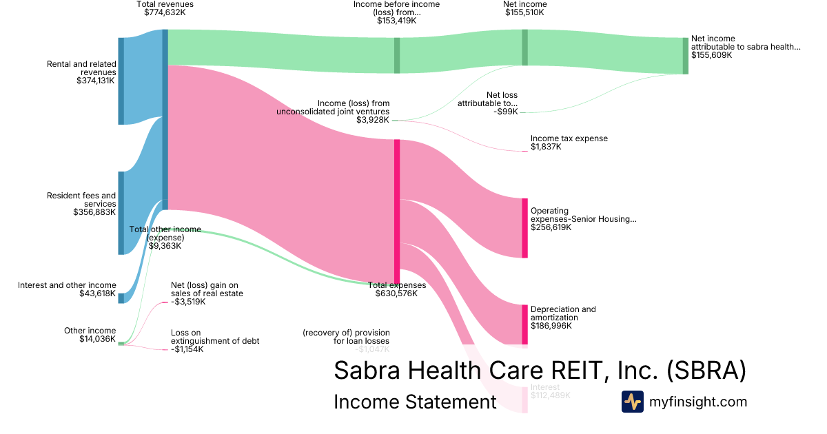 For the year ending 2025-12-31, SBRA made $774,632K in revenue. $155,609K in net income. Net profit margin of 20.09%.