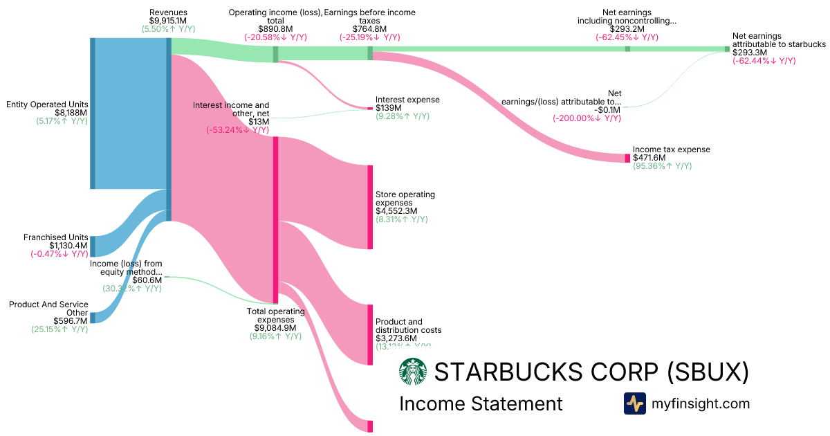 For the quarter ending 2025-12-28, SBUX made $9,915.1M in revenue. $293.3M in net income. Net profit margin of 2.96%.
