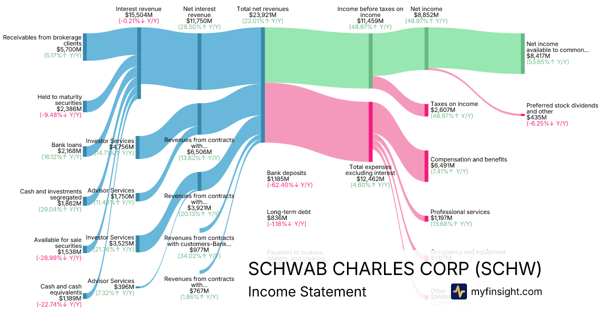 For the year ending 2025-12-31, SCHW made $23,921M in revenue. $8,417M in net income. Net profit margin of 35.19%.
