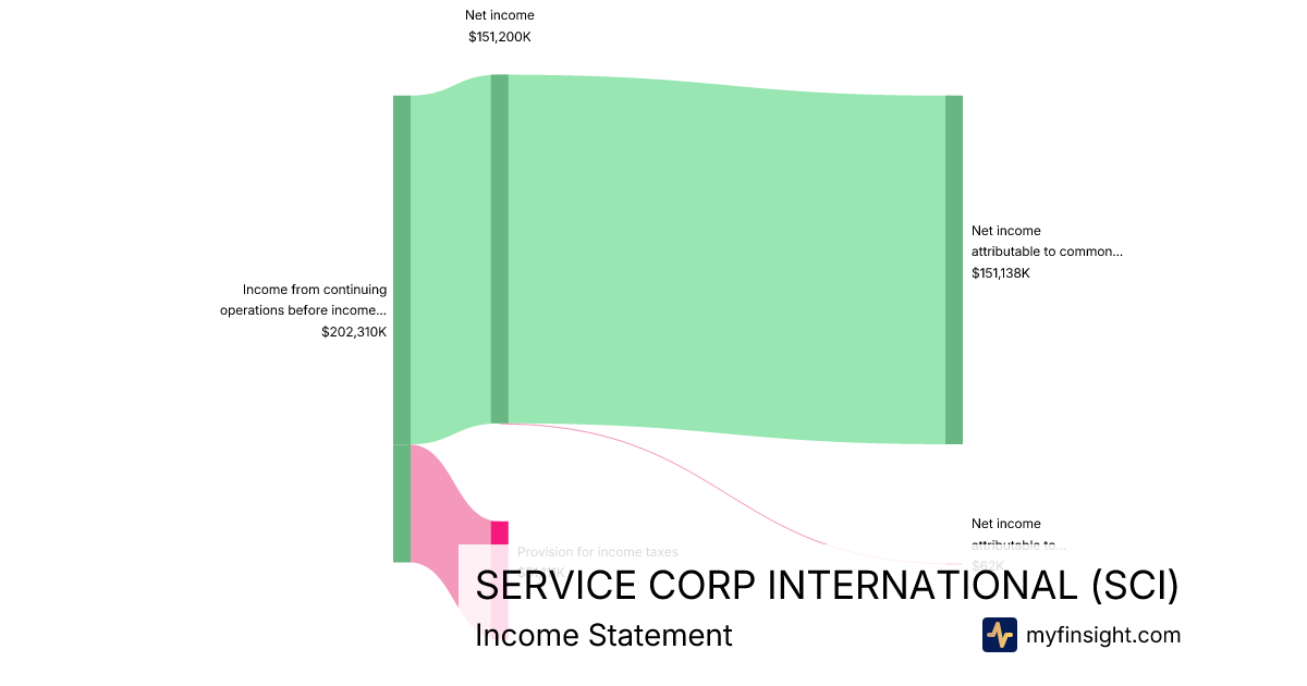 For the year ending 2025-12-31, SCI made $729,783K in revenue. $542,614K in net income. Net profit margin of 74.35%.