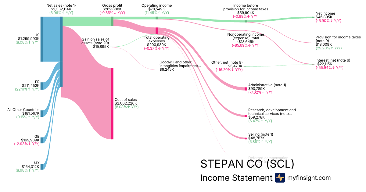 For the year ending 2025-12-31, SCL made $2,332,114K in revenue. $46,895K in net income. Net profit margin of 2.01%.