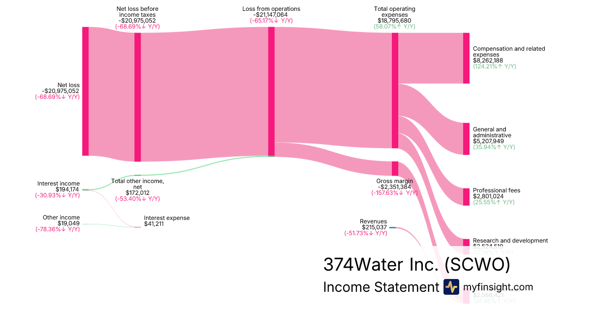 For the year ending 2025-12-31, SCWO made $215,037 in revenue. -$20,975,052 in net income. Net profit margin of -9754.16%.