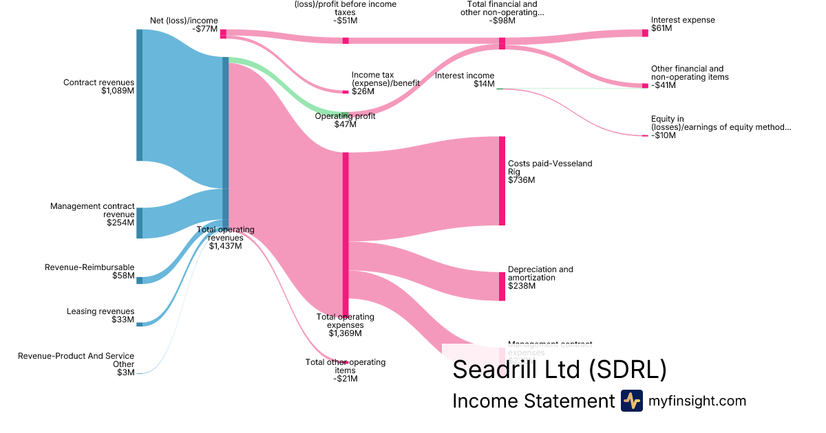 For the year ending 2025-12-31, SDRL made $1,437M in revenue. -$77M in net income. Net profit margin of -5.36%.