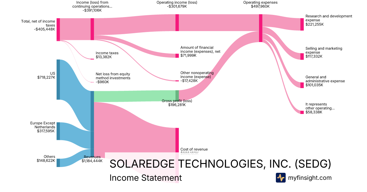 For the year ending 2025-12-31, SEDG made $1,184,444K in revenue. -$405,448K in net income. Net profit margin of -34.23%.