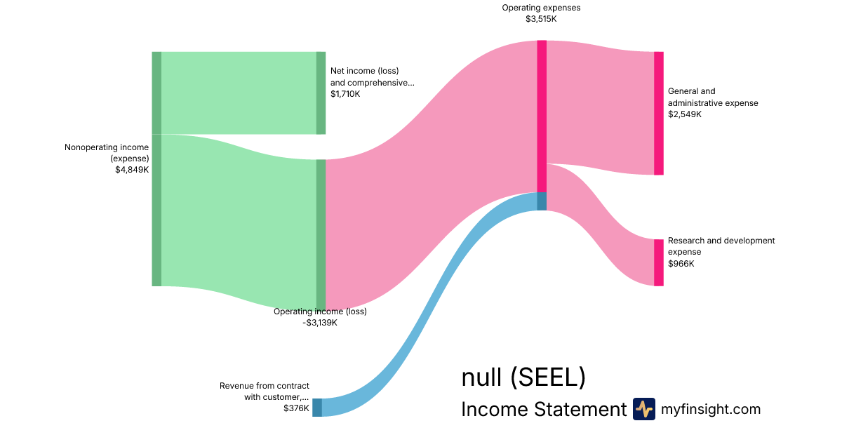 For the quarter ending 2024-06-30, SEEL made $376K in revenue. $1,710K in net income. Net profit margin of 454.79%.