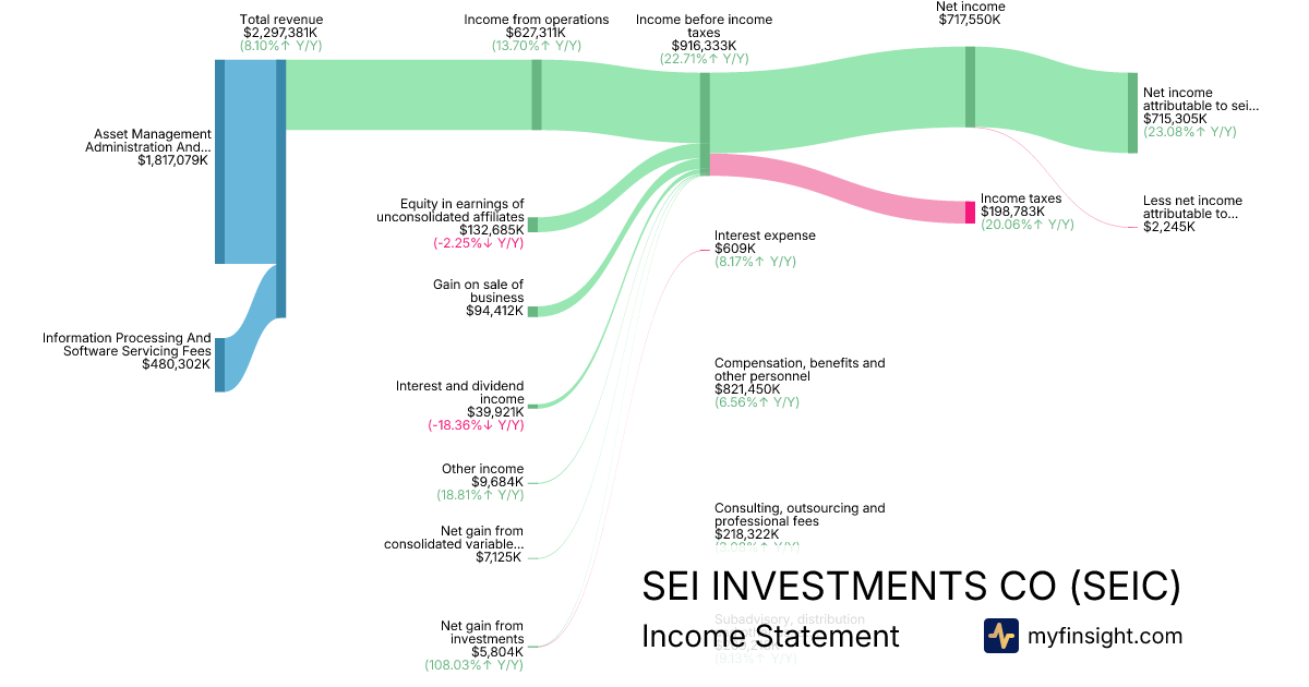 For the year ending 2025-12-31, SEIC made $2,297,381K in revenue. $715,305K in net income. Net profit margin of 31.14%.