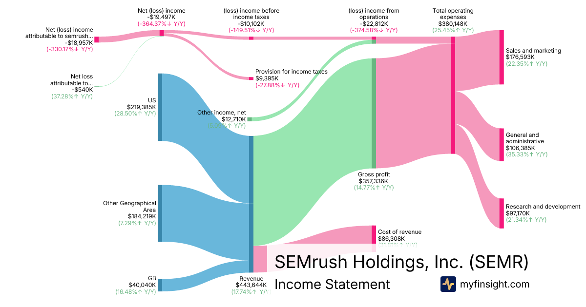 For the year ending 2025-12-31, SEMR made $443,644K in revenue. -$18,957K in net income. Net profit margin of -4.27%.