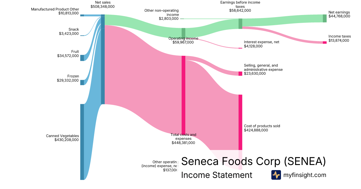 For the quarter ending 2025-12-27, SENEA made $508,348,000 in revenue. $44,768,000 in net income. Net profit margin of 8.81%.