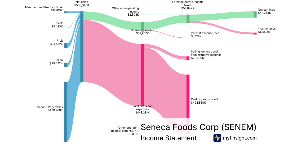 For the quarter ending 2025-12-27, SENEM made $508,348K in revenue. $44,768K in net income. Net profit margin of 8.81%.