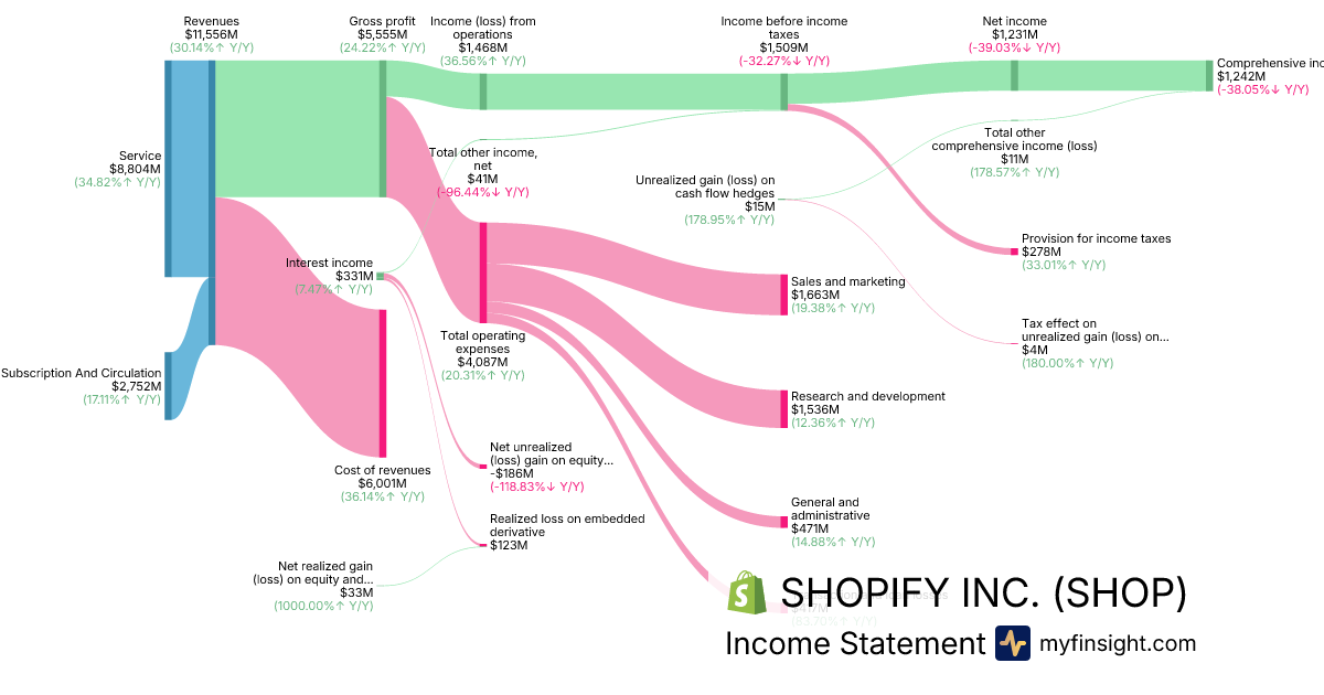 For the year ending 2025-12-31, SHOP made $11,556M in revenue. $1,242M in net income. Net profit margin of 10.75%.