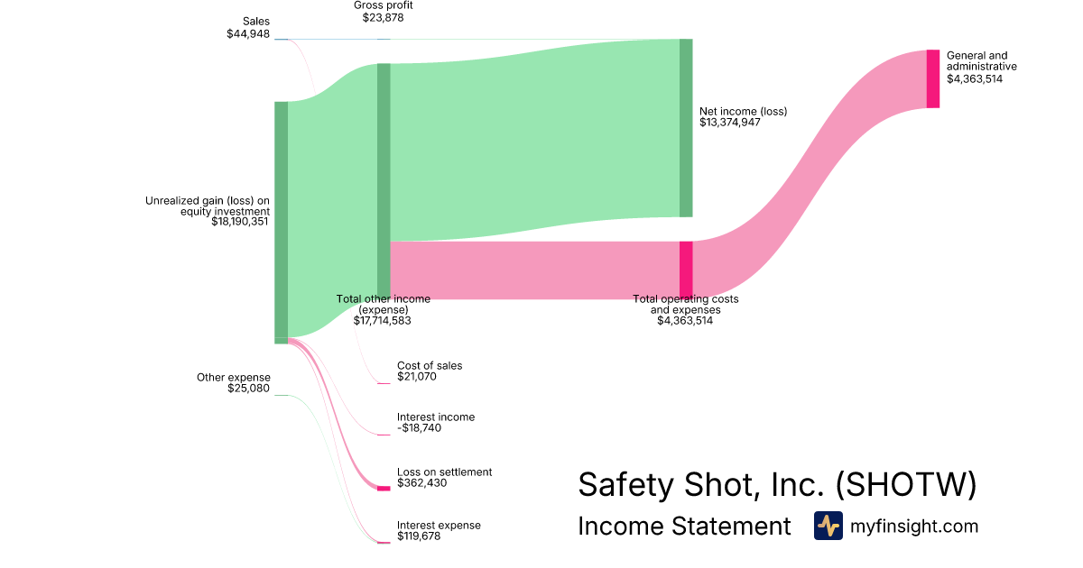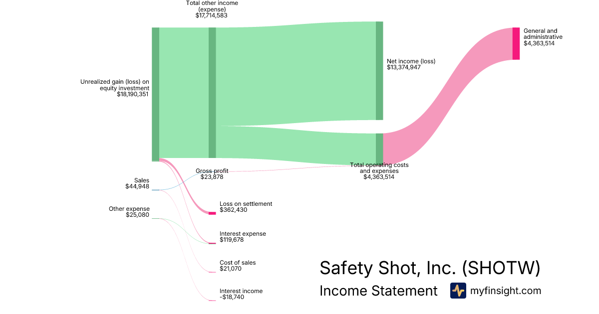 For the quarter ending 2025-06-30, SHOTW made $44,948 in revenue. $13,374,947 in net income. Net profit margin of 29756.49%.