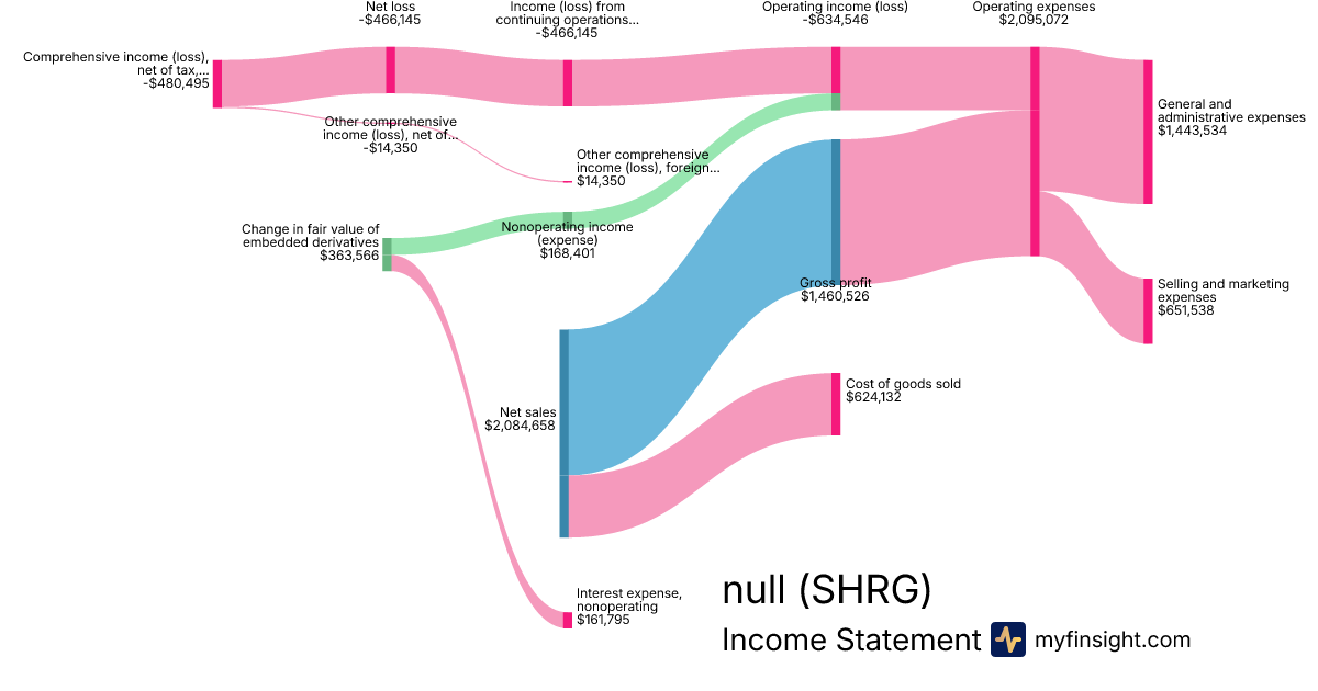 For the quarter ending 2024-09-30, SHRG made $2,084,658 in revenue. -$480,495 in net income. Net profit margin of -23.05%.