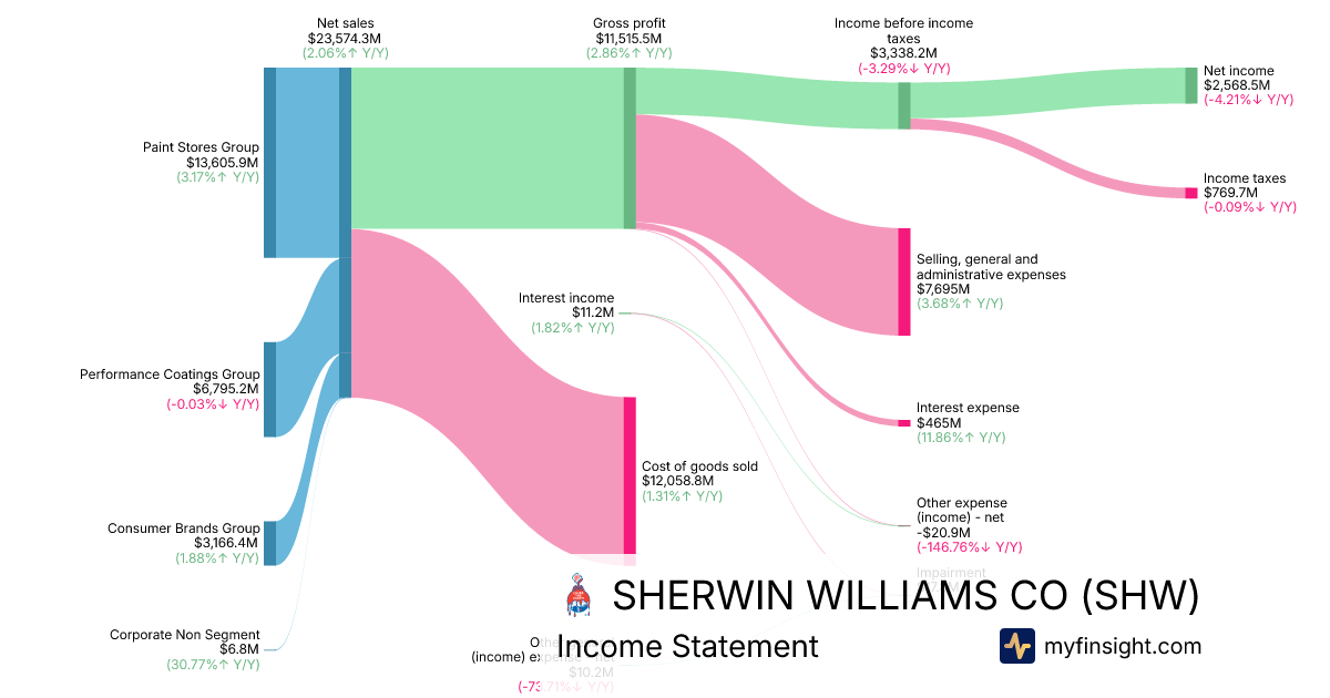For the year ending 2025-12-31, SHW made $23,574.3M in revenue. $2,568.5M in net income. Net profit margin of 10.90%.