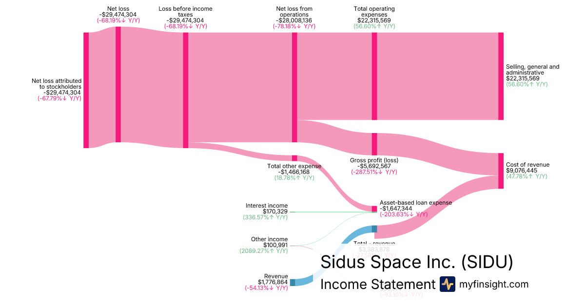 For the year ending 2025-12-31, SIDU made $3,383,878 in revenue. -$29,474,304 in net income. Net profit margin of -871.02%.
