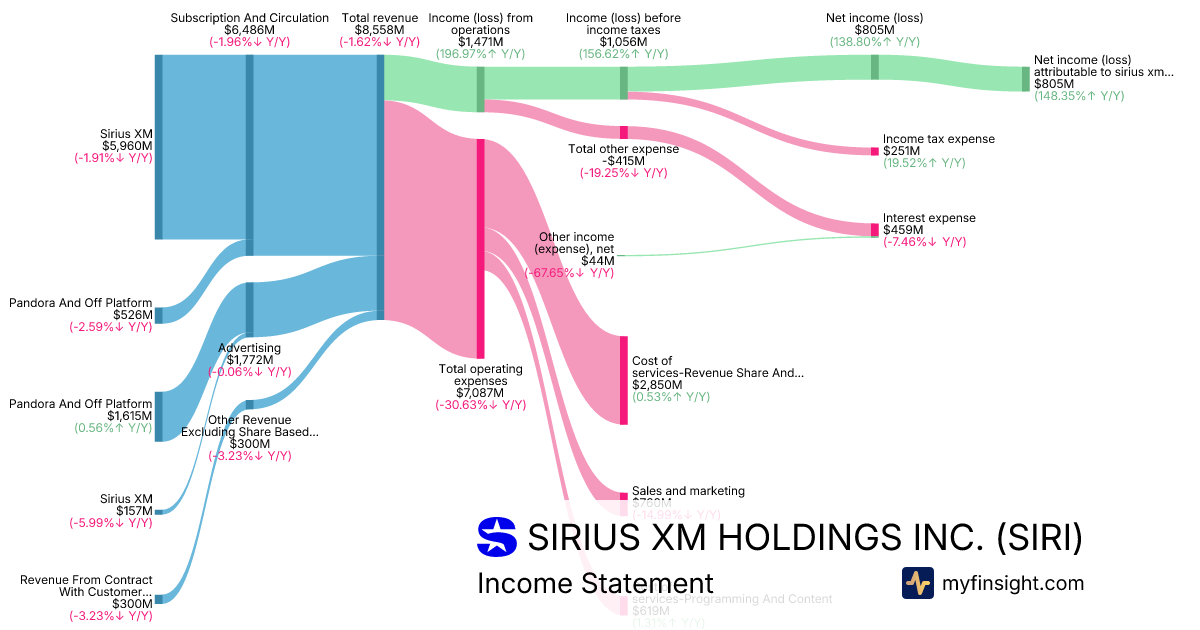 For the year ending 2025-12-31, SIRI made $8,558M in revenue. $805M in net income. Net profit margin of 9.41%.