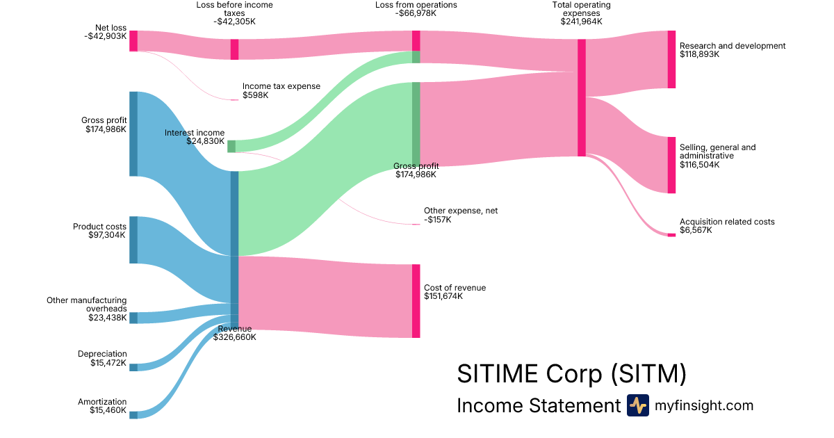 For the year ending 2025-12-31, SITM made $326,660K in revenue. -$42,903K in net income. Net profit margin of -13.13%.