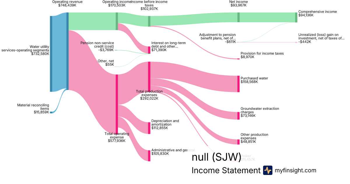 For the year ending 2024-12-31, SJW made $748,439K in revenue. $94,136K in net income. Net profit margin of 12.58%.