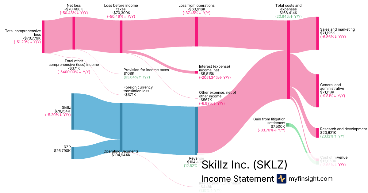 For the year ending 2025-12-31, SKLZ made $104,496K in revenue. -$70,779K in net income. Net profit margin of -67.73%.