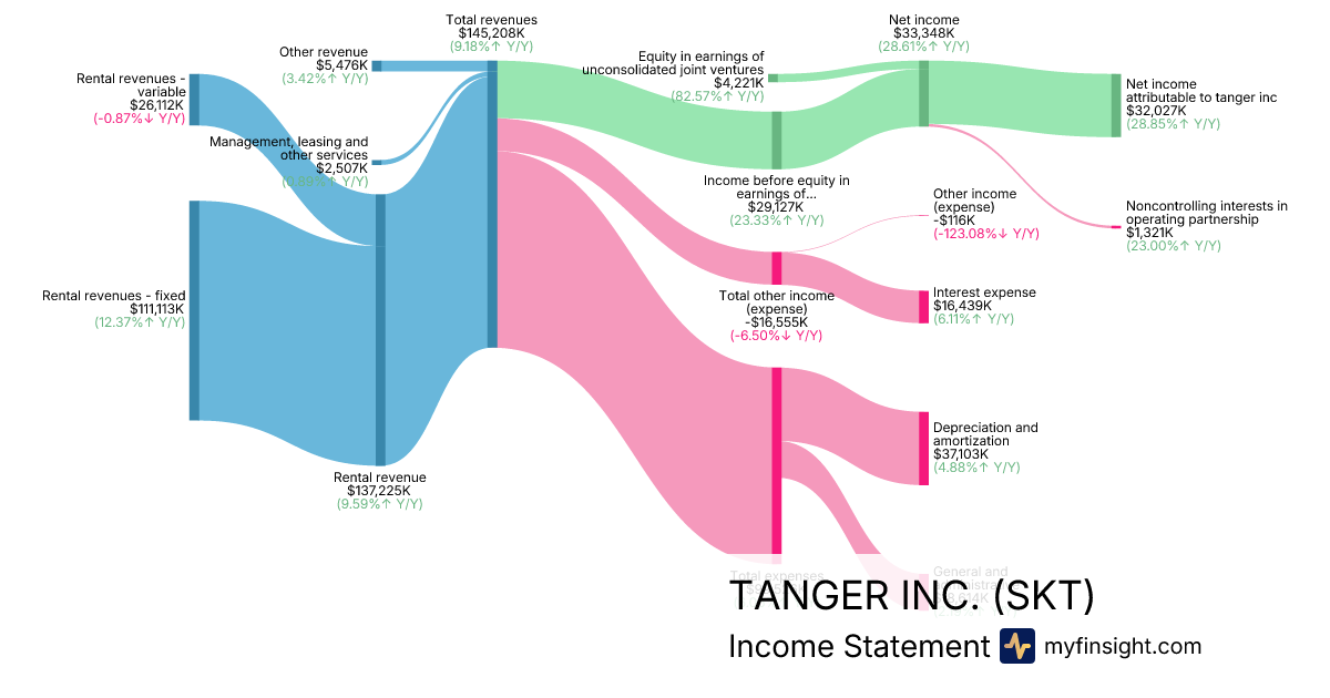For the quarter ending 2025-09-30, SKT made $145,208K in revenue. $32,027K in net income. Net profit margin of 22.06%.